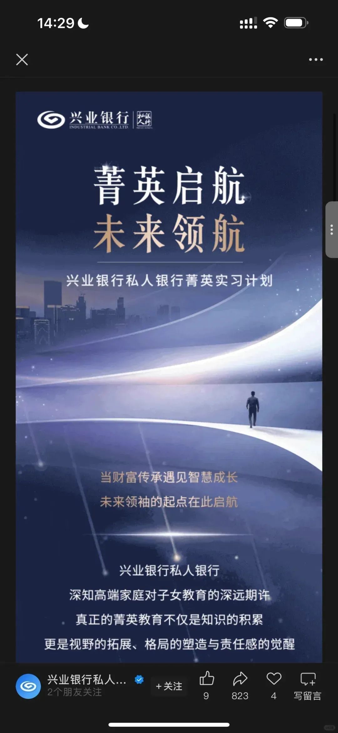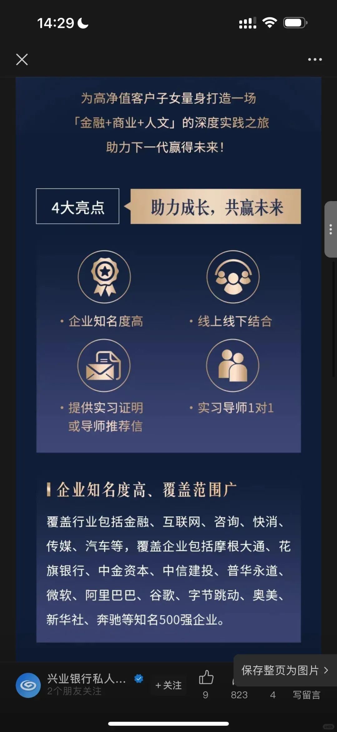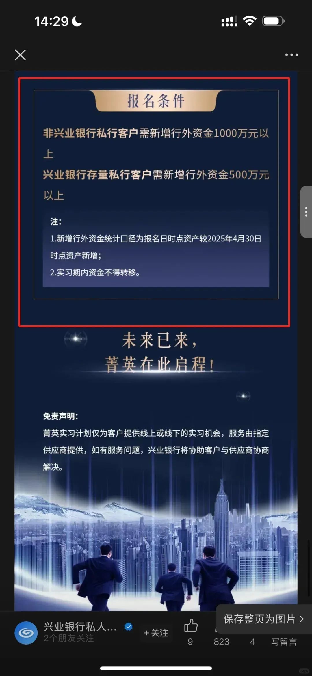 有网友在社交平台爆料,兴业银行私人银行在微信公众号发文称,“2025菁英实习计划”正式启幕,可以为高净值客户子女量身打造实践机会。其中不乏大小摩、高盛、中金资本、谷歌、微软、字节跳动、中信建投等。报名条件为,“非兴业银行私行客户需新增行外资金1000万元以上,兴业银行存量私行客户需新增行外资金500万元以上”,并且要求实习期内资金不得转移。